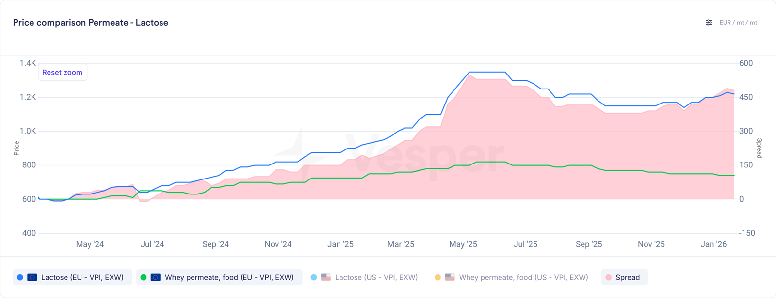 • الخصم على النفاذ مقارنة باللاكتوز يصل إلى مستويات عالية مرة أخرى في كل من أوروبا والولايات المتحدة، مما ينبغي أن يحفز المزيد من إنتاج اللاكتوز لمن يستطيع