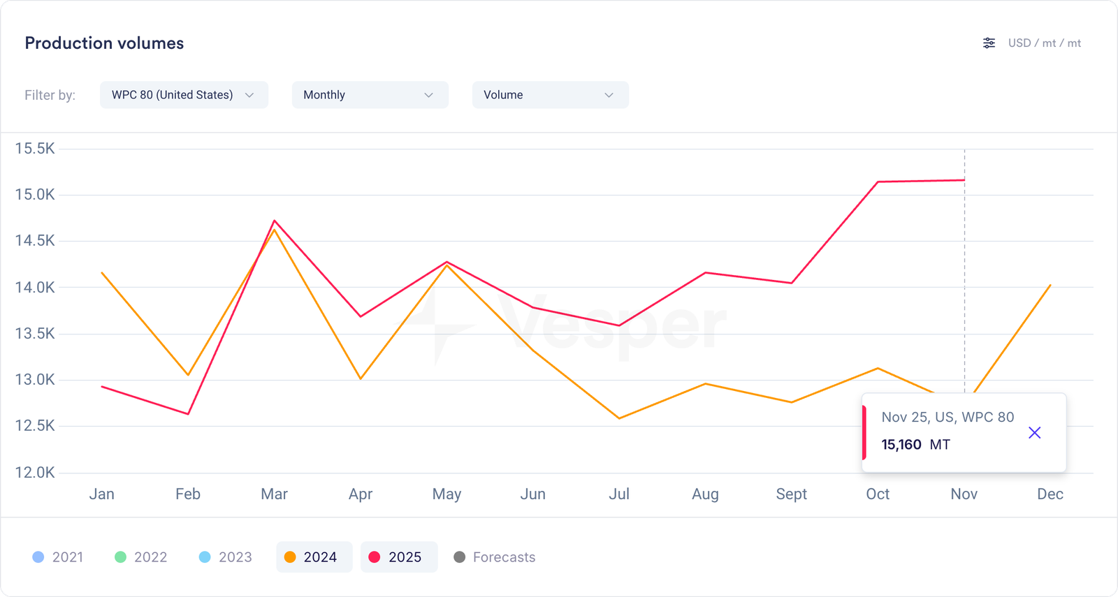 • ارتفع الإنتاج، خاصة في الولايات المتحدة، حيث ارتفعت أحجام نوفمبر بنسبة 19.22٪ على أساس سنوي بسبب زيادة الطاقة الإنتاجية، لكنها لا تزال غير كافية