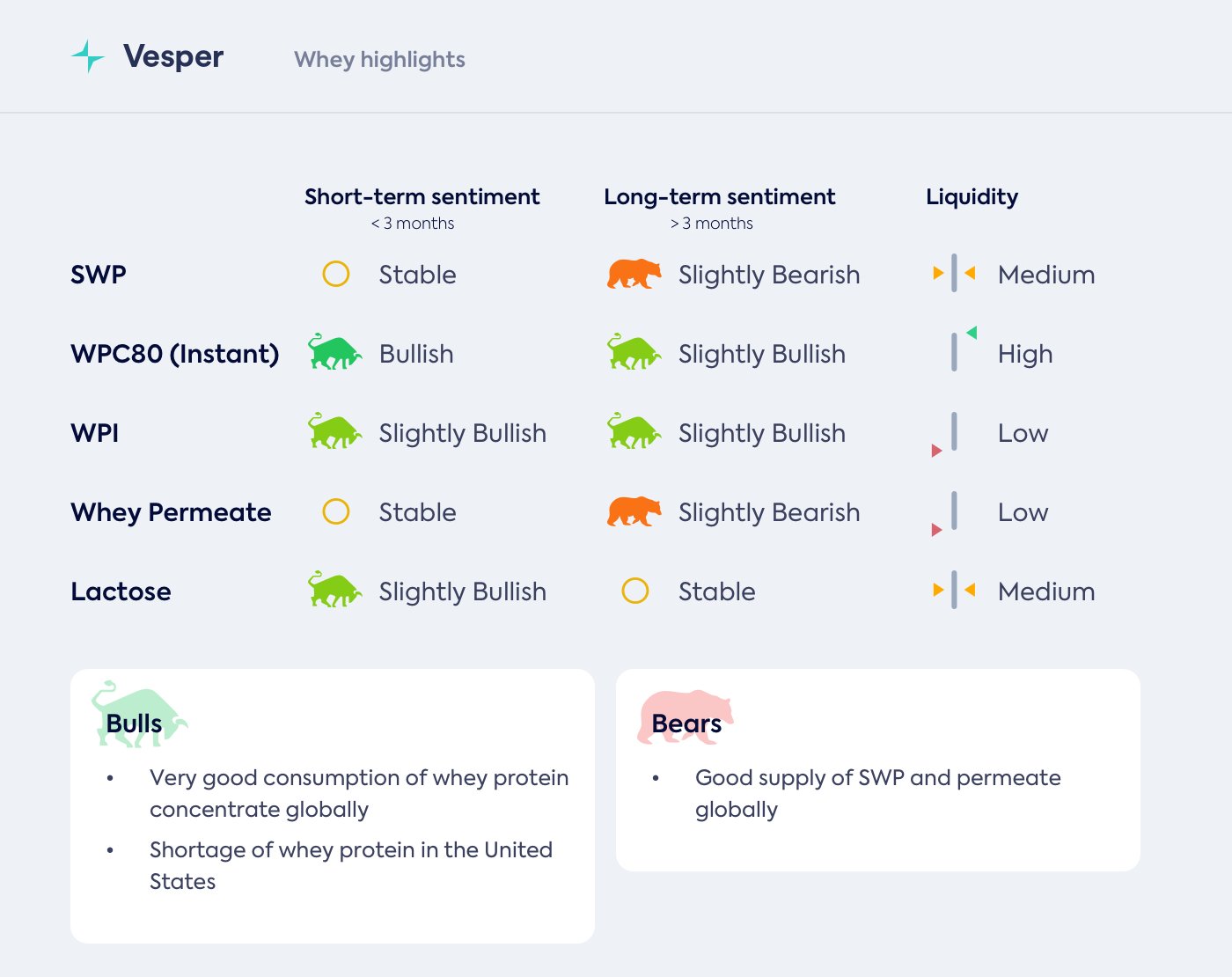 من المحتمل أن يظل سوق مسحوق مصل اللبن مستقرًا حول مستويات الأسعار الحالية في الربعين المقبلين. في حين أن إنتاج الجبن لا يزال يوفر أحجامًا كافية من مصل اللبن، فإن سوق مركزات مصل اللبن باهظة الثمن يوفر دعمًا قويًا للحد الأدنى لتسعير مسحوق مصل اللبن.