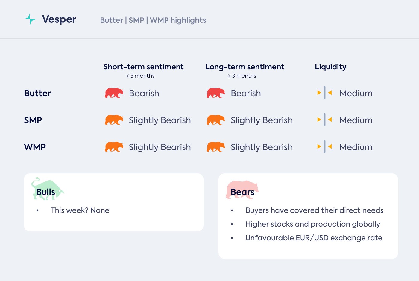 التوقعات لسوق الزبدة ضعيفة للغاية في الوقت الحالي، مع انخفاض الأسعار في جميع المناطق بسبب تحسن العرض العالمي. بالنسبة للأيام والأسابيع القادمة، نتوقع أن تستمر الأسواق الأوروبية والأمريكية في الشعور بالهبوط الشديد، في حين أن السوق في أوقيانوسيا يمكن أن يحافظ على سعر أفضل قليلاً.