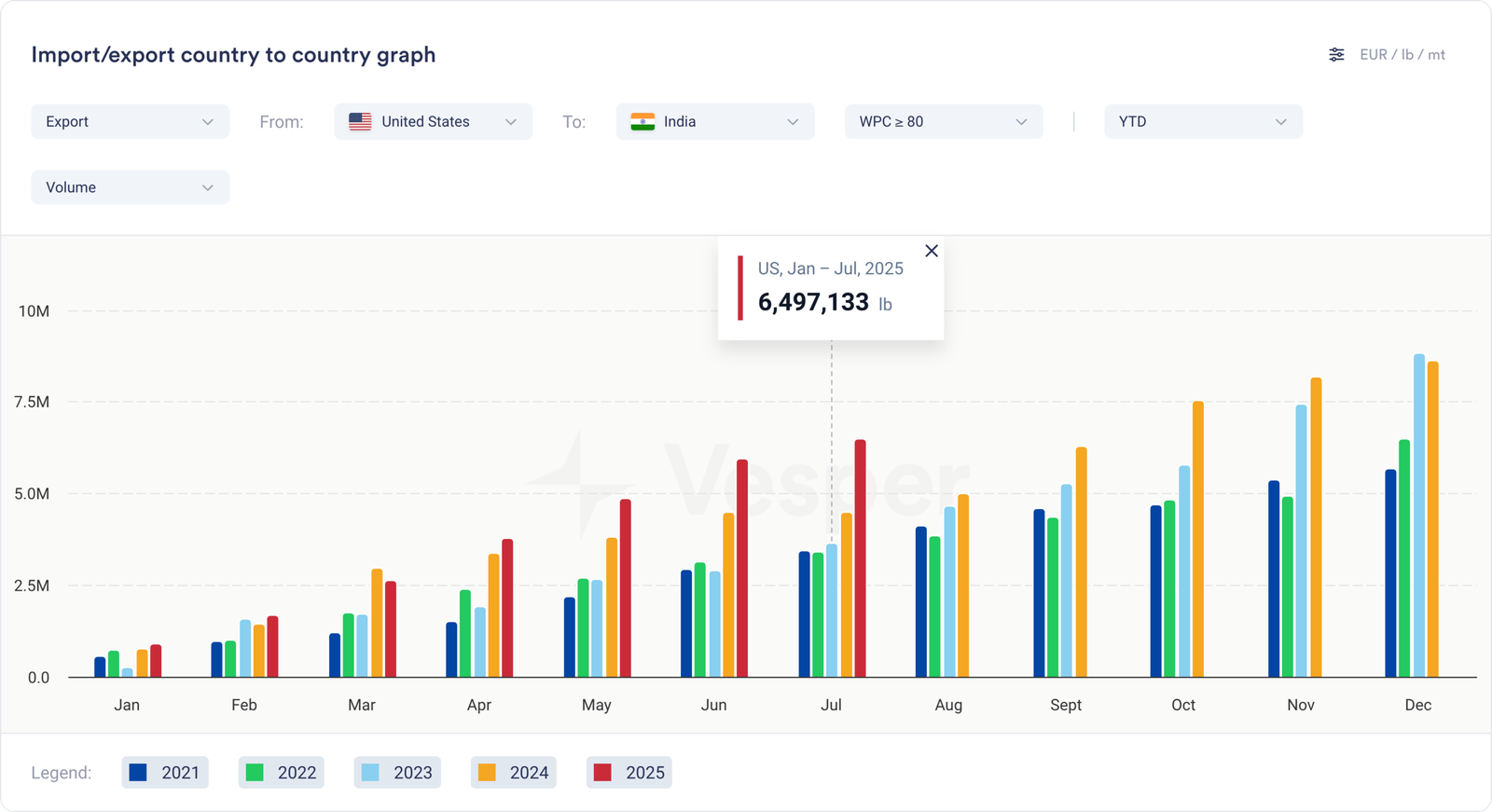 البروتينات الأعلى: هنا تهيمن الولايات المتحدة. استوردت الهند حوالي 10 ملايين رطل من WPC80+ في عام 2024، وكانت الولايات المتحدة هي المورد الأول (على الرغم من أن بيانات الهند تظهر 10 ملايين بينما تظهر بيانات التصدير الأمريكية 8.6 مليون – تناقضات نموذجية في التقارير). يمثل هذا حوالي 4.4٪ من إجمالي صادرات البروتين العالي في الولايات المتحدة البالغ 195 مليون رطل.
