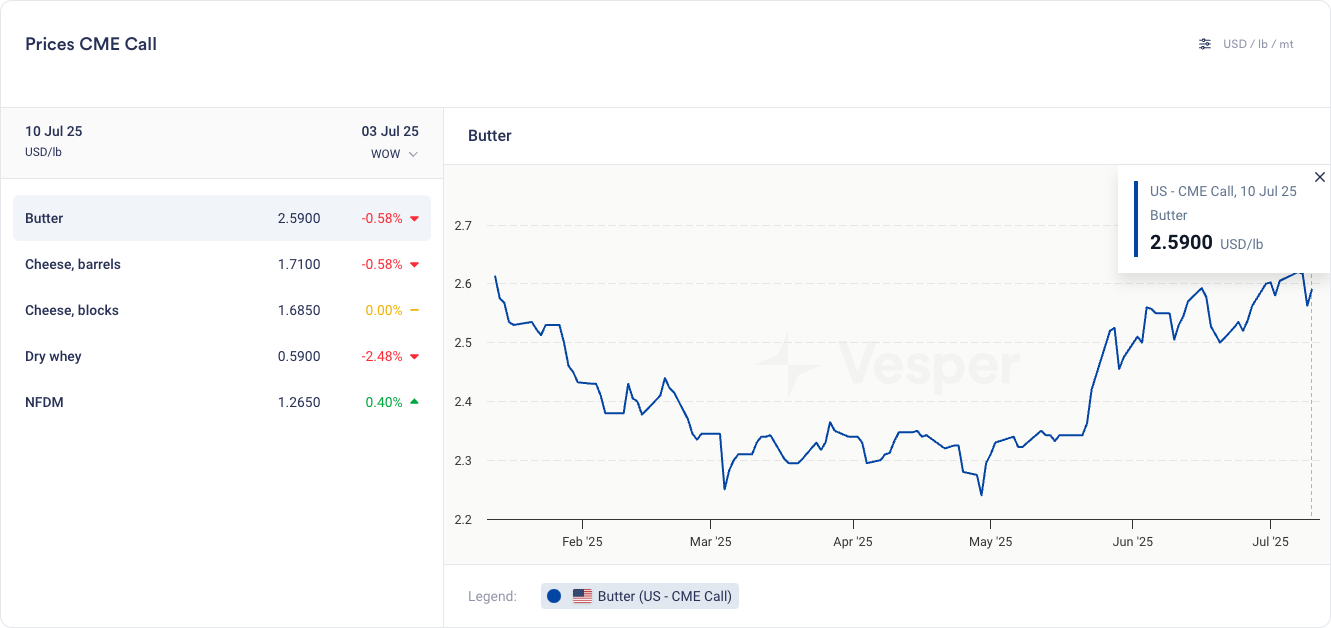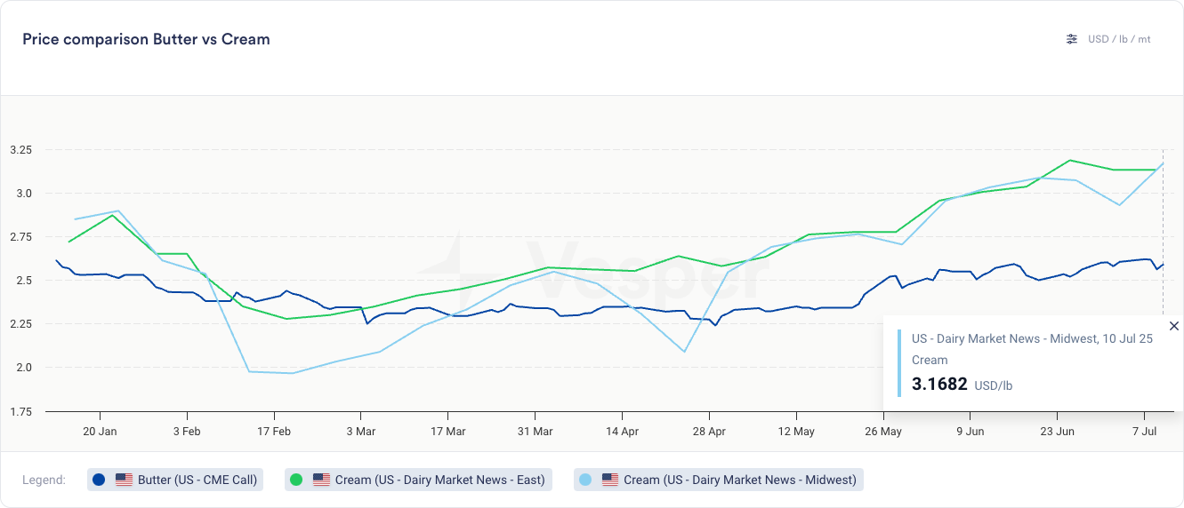 انخفض الزبد هذا الأسبوع قبل أن يتعافى قليلاً يوم الخميس. أثبتت المخزونات أن الزبد متوفر، ولكن ليس بكميات مفرطة. في الوقت نفسه، أصبح الزبد الطازج مكلفًا بشكل متزايد حيث ارتفعت أسعار القشدة في الولايات المتحدة من أقل بقليل من 2 دولار أمريكي للرطل إلى ما فوق 3 دولارات أمريكية للرطل الآن، مما يضمن بالفعل بيع جميع الزبد الطازج بسعر 2.5 دولار أمريكي للرطل أو أعلى.