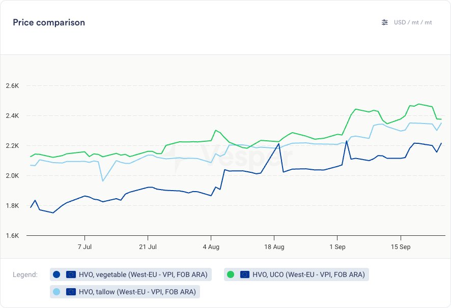 • أسعار HVO في انخفاض طفيف أيضًا، مع اتساع الفروق بين أنواع HVO المختلفة