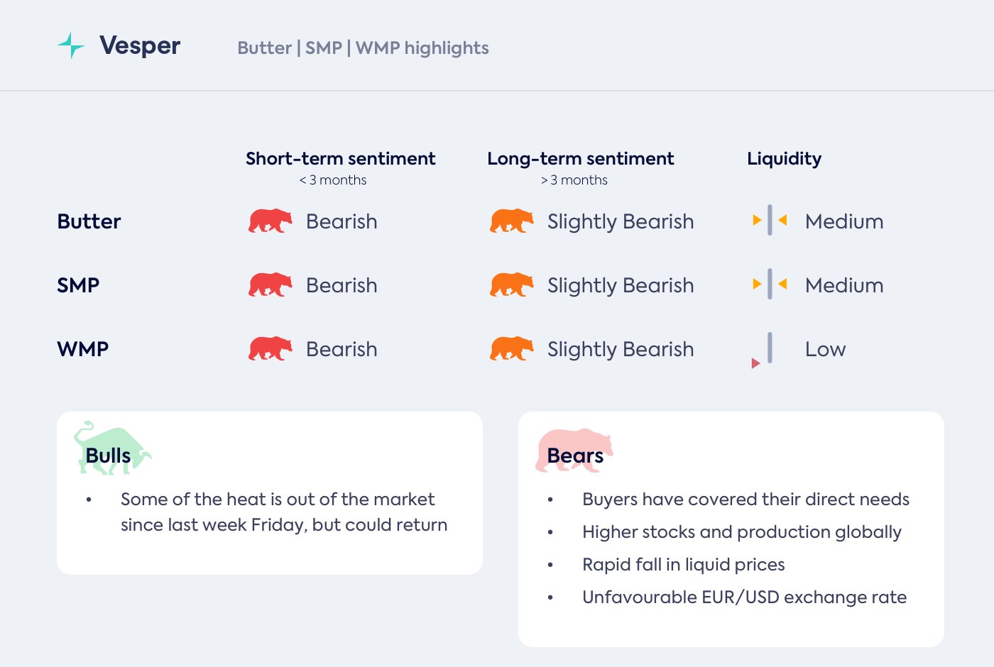 لا تزال توقعاتنا لبقية العام ضعيفة، حيث تشعر السوق الفورية بثقل شديد وتتوفر المنتجات الطازجة والمخزنة في جميع المناطق تقريبًا. هذه الكميات العالية بشكل لا يصدق من إنتاج الحليب تؤدي ببساطة إلى إمدادات سلع عالية جدًا، مما يؤثر سلبًا بشكل واضح على الأسعار.