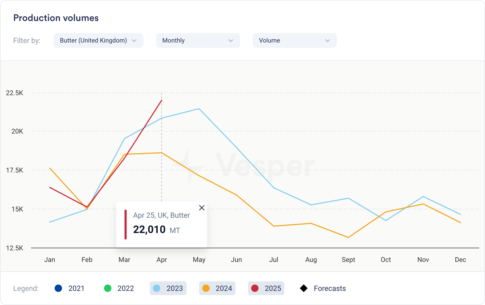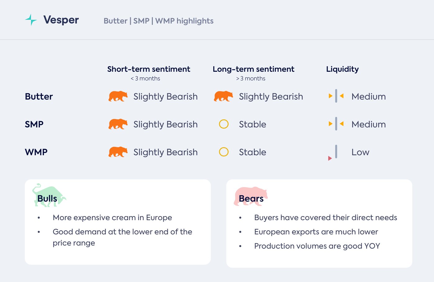 • من الناحية الأساسية، نرى أرقام إنتاج مرتفعة نسبيًا في جميع أنحاء أوروبا، في حين أن الواردات المرتفعة والصادرات المنخفضة تجلب وتحافظ أيضًا على المزيد من الزبدة في السوق الأوروبية