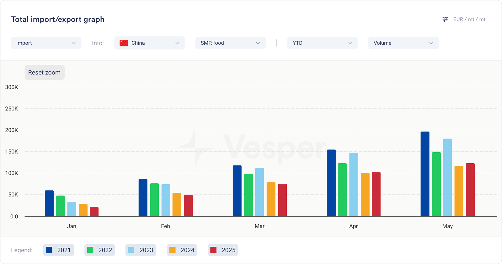 • الواردات الصينية في عام 2025 حتى الآن مماثلة للواردات في عام 2024 (+0.07%)، في حين أن أحجام الإنتاج -27.13% منخفضة بشكل كبير