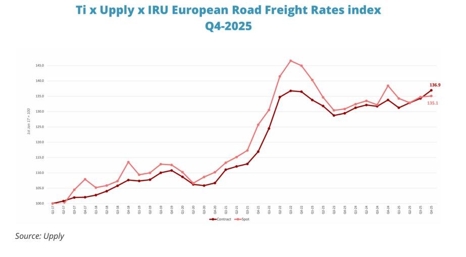 لأول مرة منذ عام 2017، تجاوزت أسعار العقود طويلة الأجل لشحن البضائع على الطرق الأوروبية أسعار السوق الفورية. ارتفعت أسعار العقود بشكل كبير في الربع الرابع، متجاوزة السوق الفورية. هذا مدفوع بالشركات التي تحدد الأسعار في وقت مبكر لتأمين القدرة على تلبية الطلب المتوقع.