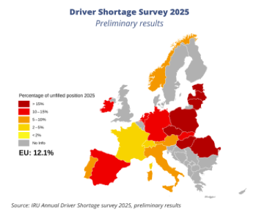 في حين أنه من المتوقع نمو متواضع في الحجم لعام 2026، تواجه الصناعة تحديًا حاسمًا: ارتفع نقص السائقين في الاتحاد الأوروبي إلى 444000 وظيفة شاغرة. من المحتمل أن يؤدي هذا النقص، خاصة في ألمانيا وأوروبا الشرقية، إلى الحفاظ على الضغط على الأسعار والقدرة طوال العام.