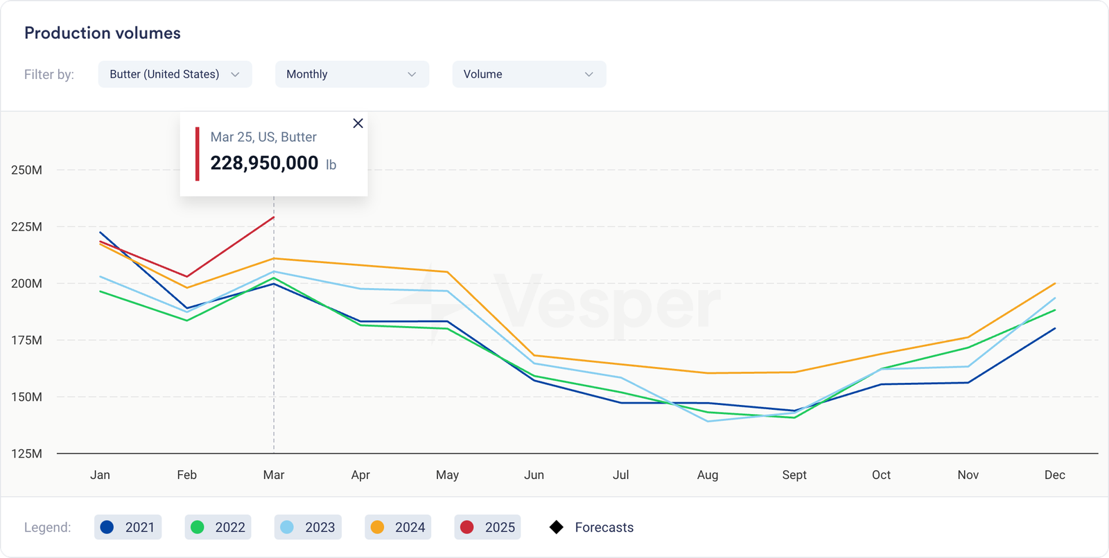 - في الولايات المتحدة، تجاوز إنتاج الزبدة مستويات العام الماضي إلى حد بعيد، حيث أشار رقم الإنتاج لشهر مارس إلى معدل نمو سنوي قدره 8.63٪، ليصل إلى 228.95 مليون رطل