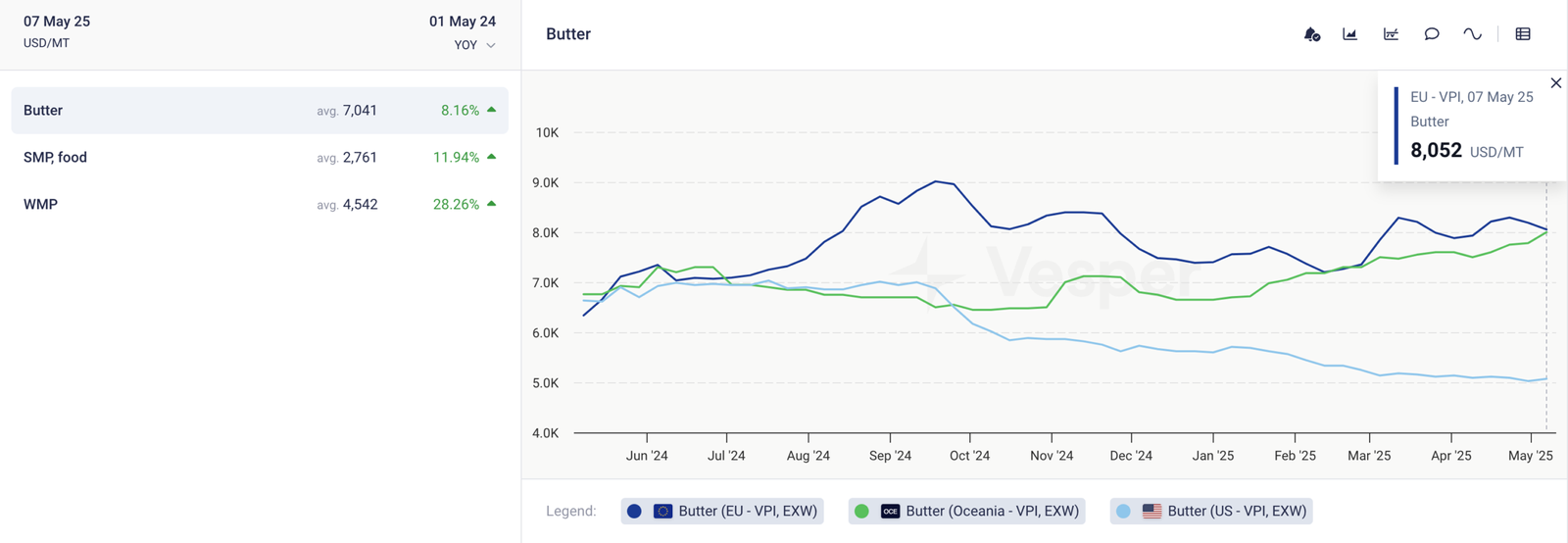 - كان المحرك الرئيسي للزيادة في مسحوق الحليب كامل الدسم في نيوزيلندا هو الحجم المحدود المعروض في نهاية موسم 24/25، والذي لا يزال يؤدي إلى الكثير من الطلب