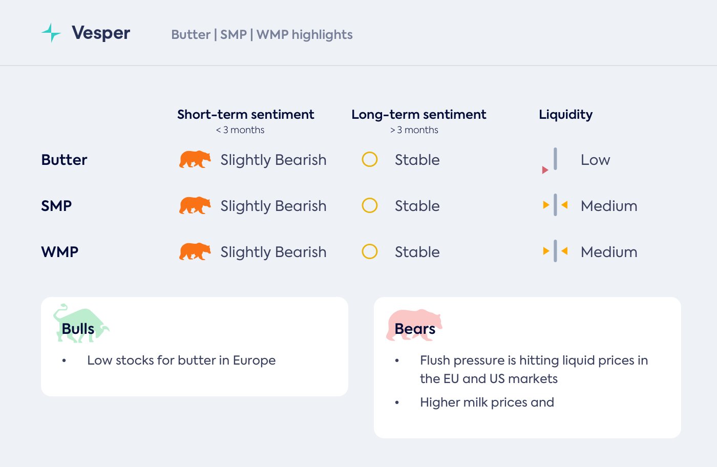 في حين أن الأساسيات تشير إلى انخفاض الأسعار والسوائل تقود الطريق بالفعل، إلا أن هناك طلبًا كبيرًا جدًا وكمية قليلة جدًا من المخزون المتاح لدفع الأسعار إلى الانخفاض حقًا. ستساعد العديد من القطع الصغيرة من اللغز مثل الطقس الجيد وارتفاع أسعار الحليب وواردات الزبدة من مناطق أخرى في الحفاظ على توازن السوق الأوروبية بشكل أكبر في النصف الثاني من العام. لكن يبقى أن نرى ما إذا كان سيتم تحقيق توازن أفضل بالفعل.