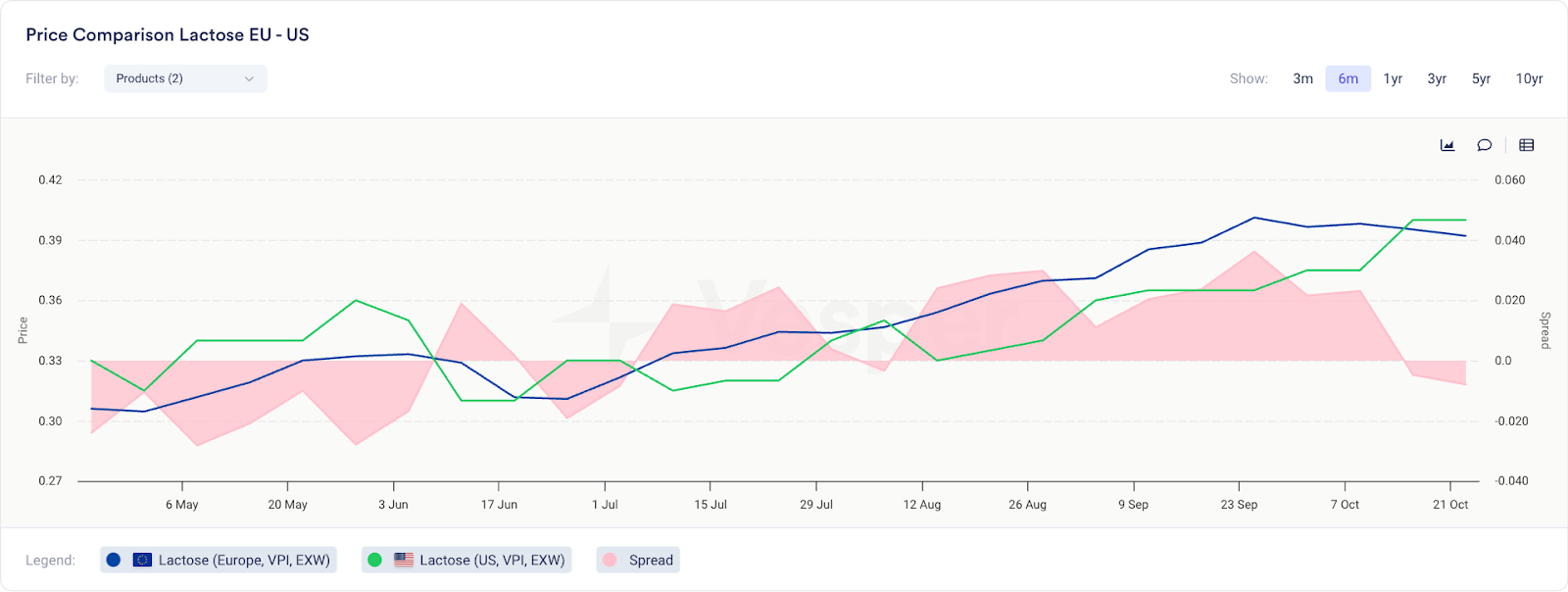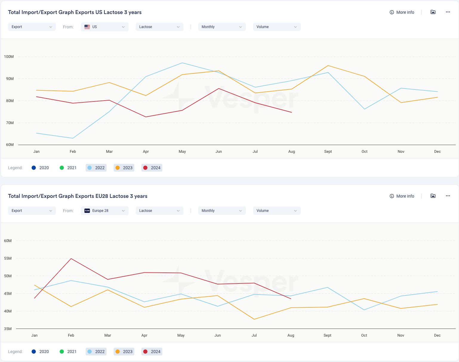 ماذا يمكننا أن نستنتج؟ يبدو أن اللاكتوز يمكن أن يكون بالفعل سوقًا حساسًا للأسعار. ومع ذلك، يجب ألا نتجاهل حقيقة أن الولايات المتحدة لا تزال تصدر ما يقرب من ضعف كمية اللاكتوز مقارنة بأوروبا. حتى الآن هذا العام، انخفضت الصادرات الأمريكية بنسبة 9.4٪ على أساس سنوي، بينما ارتفعت صادرات أوروبا بنسبة 13.5٪. من الواضح أن هناك تحولًا من مصادر الولايات المتحدة إلى مصادر الاتحاد الأوروبي، ولكن بشكل عام، نشهد أيضًا انخفاضًا في الأحجام. إذن، ما الذي يدفع هذا؟