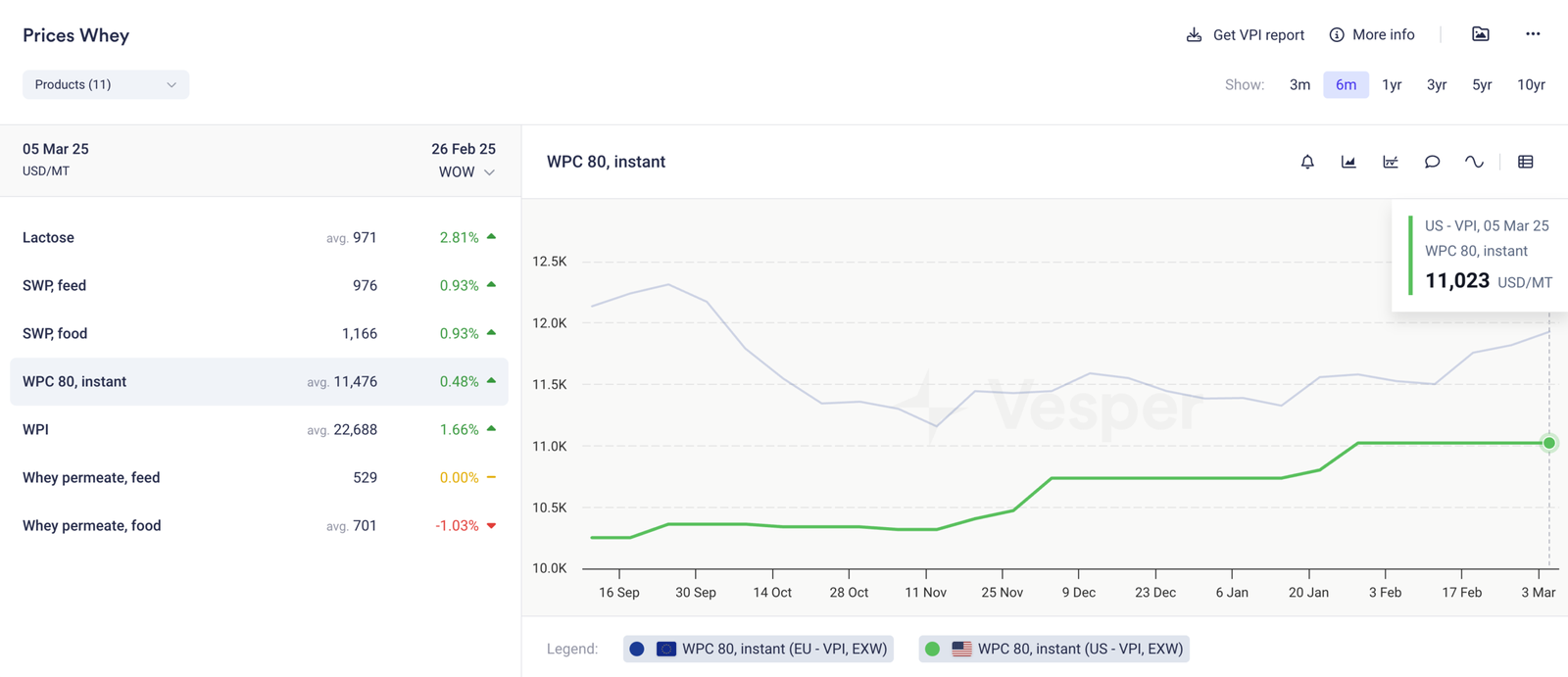 عندما نضع بيانات التدفق التجاري هذه مقابل معايير الأسعار الحالية، تصبح القصة مثيرة للاهتمام. أظهرت EU WPI و WPC80 علاوة صغيرة ولكنها واضحة على نظيراتها الأمريكية – ولكنها ليست كافية لتحمل التحول التنافسي لتعريفة 10٪. نظرًا لأن البروتينات الأعلى في أسعار قياسية مرتفعة، فإن الفرق المطلق بين الاثنين كبير، ولكن يمكن حسابه بسهولة عند إضافة 10٪ إلى أسعار الولايات المتحدة.