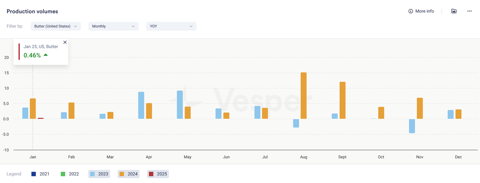 على جبهة الجبن، الموزاريلا هي الفائز الكبير بنمو +3.59٪ في الإنتاج، في حين فقد الشيدر -1.35٪ على أساس سنوي. لا يزال إجمالي إنتاج الجبن مرتفعًا بنسبة +0.78٪، مما يؤكد المشاعر الأضعف فيما يتعلق بإنتاج الجبن في عام 2025.