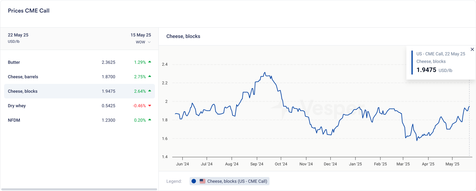 أسعار الجبن تقترب الآن من 2 دولار أمريكي للرطل بعد الزيادة الأخيرة في الطلب. كان الإنتاج أبطأ قليلاً من المتوقع من جميع المصانع الجديدة، مما ترك بعض المشترين في وضع أسوأ مما كانوا يفضلون. لا يوجد نقص في الجبن، نرى في المقام الأول أن هناك الكثير من المشترين في الخارج.
