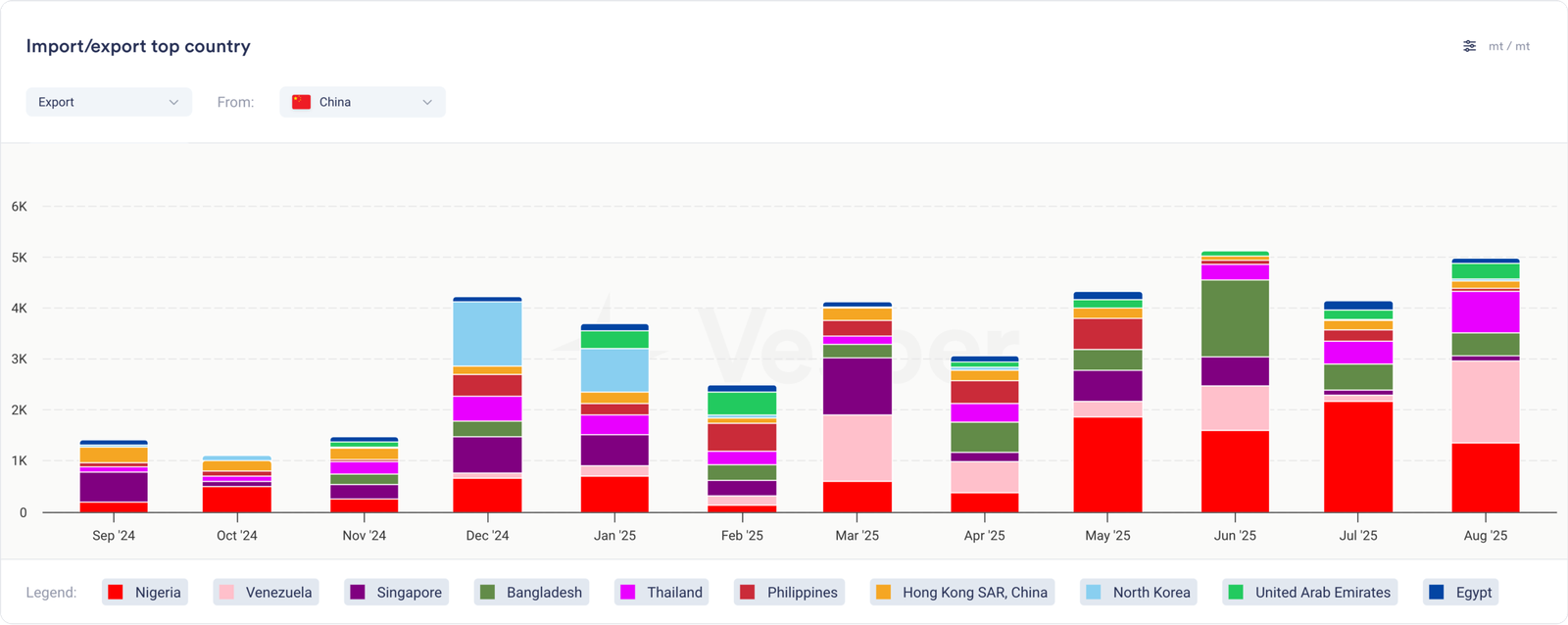 نعم، الصادرات تذهب إلى بلدان مختلفة، ولم نعثر بعد على هيكل معين في مسارات التجارة. تناوبت نيجيريا وفنزويلا وبنغلاديش وتايلاند والفلبين وكوريا الشمالية في شراء مسحوق الحليب كامل الدسم الصيني منذ ديسمبر 2024.