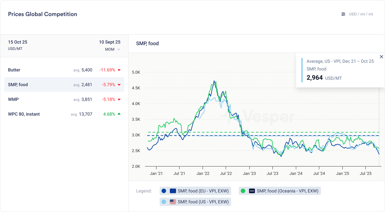 إحدى الميزات المقيمة بأقل من قيمتها لبيانات الاستيراد/التصدير لدينا هي معلومات التسعير. عند النظر إلى مستويات الأسعار المقتبسة لمسحوق الحليب كامل الدسم الصيني المصدر، يتضح بشكل متزايد كيف يتمكن الصينيون من العثور على مشترين في جميع أنحاء العالم لمسحوق الحليب كامل الدسم الخاص بهم. إنهم يبيعونه بأقل بكثير من السوق العالمية. يقل سعرهم البالغ 3194 دولارًا أمريكيًا للطن المتري بنسبة 40% عن سعر مسحوق الحليب كامل الدسم المستورد إلى الصين، والذي يتم تداوله بسعر 5042 دولارًا أمريكيًا للطن المتري.