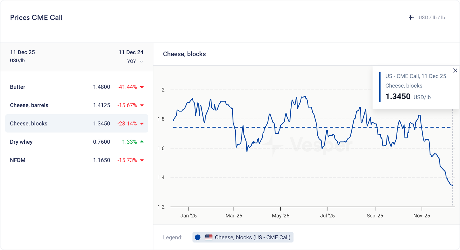 عند مقارنة أسعار اليوم بأسعار ديسمبر من العام الماضي، يمكننا أن نرى أن الزبدة والجبن وNFDM (مسحوق الحليب المجفف الخالي من الدسم) كلها كافحت للحفاظ على أسعارها. كان الإنتاج (ولا يزال) رائعًا، والاستهلاك يتباطأ بسبب ارتفاع الأسعار، في حين أن الطلب على التصدير ليس من السهل تحقيقه عندما تتنافس أوروبا ونيوزيلندا ضدك.