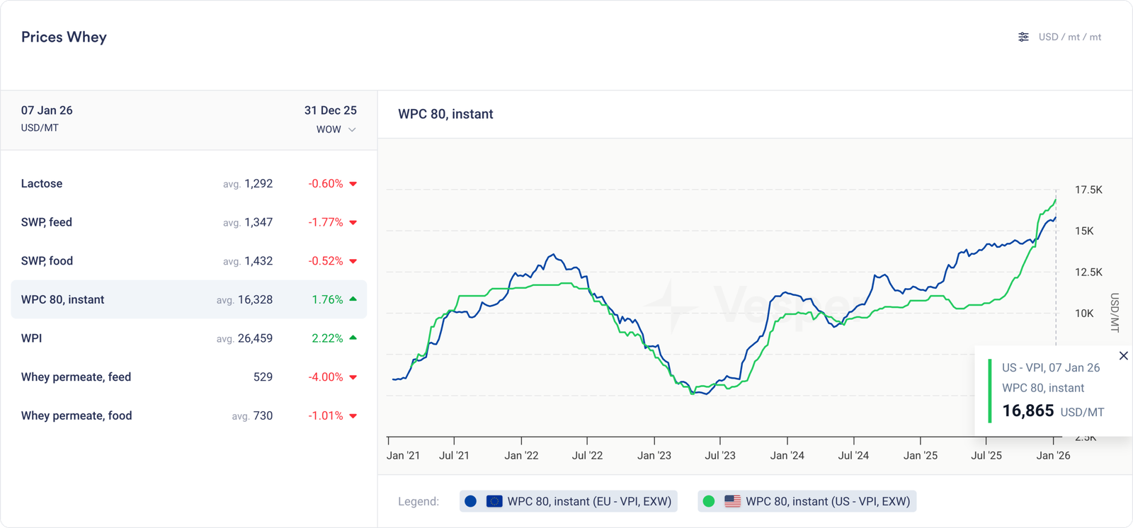 فقد مصل اللبن بعض الأرضية هذا الأسبوع، وهو ما يتناقض مع أسعار WPC80 و WPI. مع ارتفاع الطلب على بروتينات مصل اللبن و عدم قدرة العرض على اللحاق بالركب، وصلنا (مرة أخرى) إلى النقطة التي يمكن للبائعين فيها أن يطلبوا أي سعر يريدونه. من يدري ما الذي يمنع أسعار بروتين مصل اللبن من التحليق فوق علامة 20000 دولار أمريكي للطن المتري؟