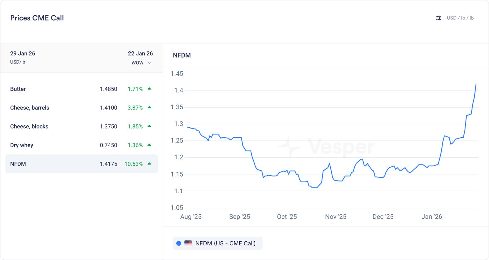 من المؤكد أن كل هذا مرتبط بقيمة الدولار الأمريكي، والذي له تأثير كبير على أي سلع يتم تداولها بالدولار الأمريكي. خاصة أسعار مسحوق الحليب في الولايات المتحدة (ولكن أيضًا نيوزيلندا والاتحاد الأوروبي) تشعر بالحرارة.