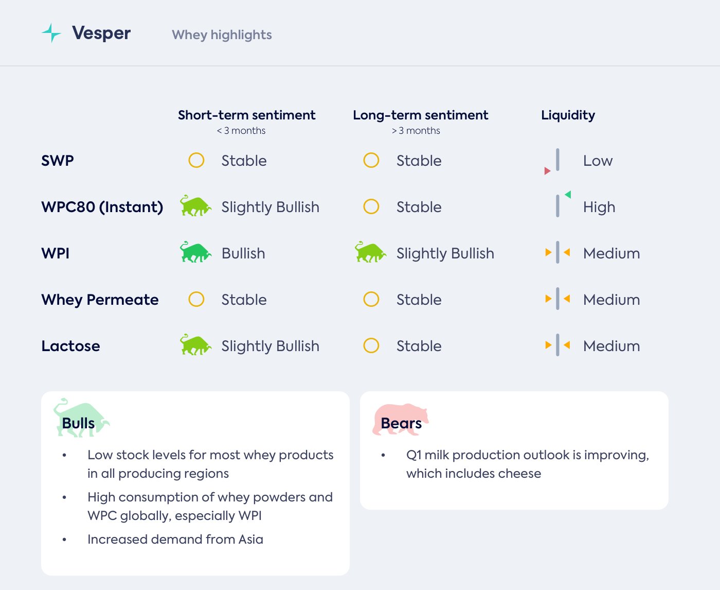 لا تزال نظرة اللاكتوز صعودية بعض الشيء، حيث أن المشترين في جميع أنحاء العالم مهتمون بالكميات والعرض ليس مفرطًا. ليس بما يكفي لتعزيز الأسعار على الفور، ولكن ما يكفي لتوفير مستوى دعم ثابت للأسعار.